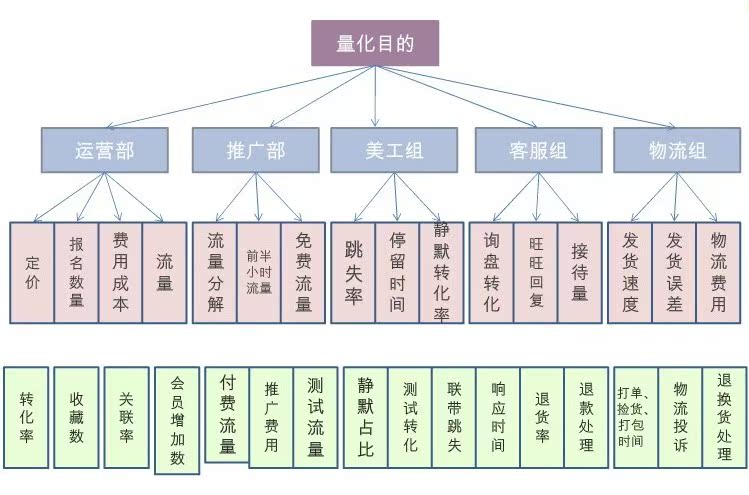 量化目的—分解目标—预估产出—划分流量引入—参考转化—评估达成—量化完成率