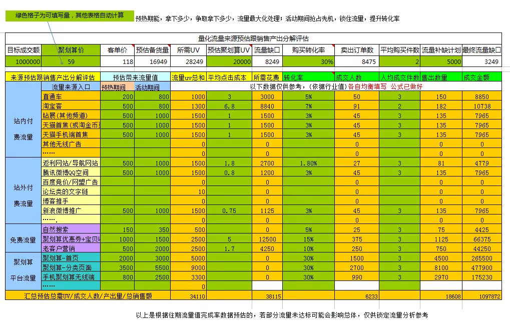 按100万产出计算,通常平均转化率30%评估,平均购买件数,平均客单价,往期聚划算流量。